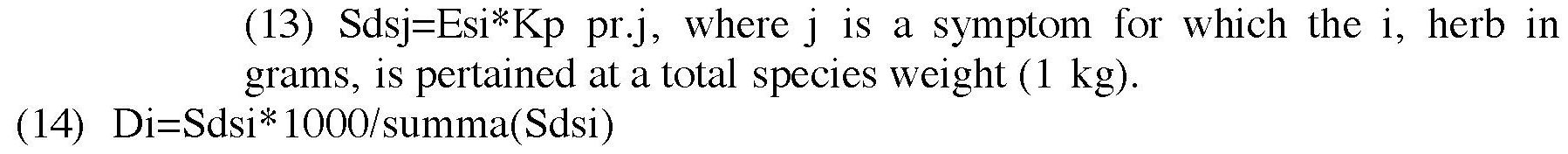 The normative coefficient Nkr is calculated with respect to the herb 002 having the highest efficiency, and the normative coefficient Nks is calculated with respect to the symptom, the action efficiency of the herb upon which is the largest (002 - Giddiness). The calculations in view of the symptom importance (Formula 13) are shown below.